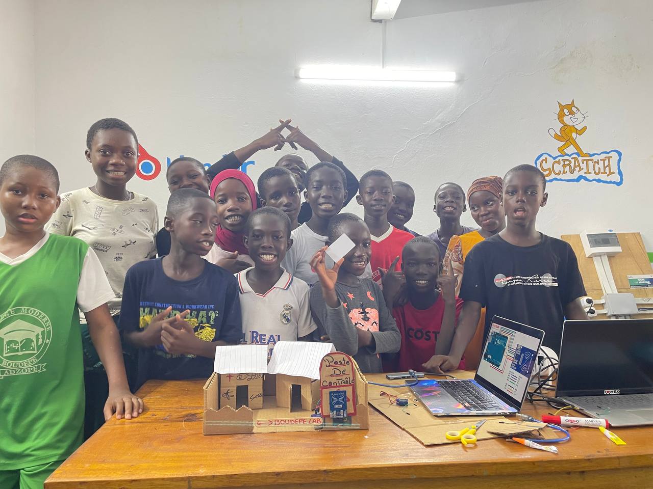 Au FabLab de Boudépé, l’apprentissage repose sur un modèle pédagogique éprouvé : l’Apprentissage Par Projet (APP). Grâce à cette approche, des enfants sans prérequis technologique ont pu, étape par étape, acquérir des compétences solides. Ils ont appris à utiliser correctement l’ordinateur, à saisir du texte, à écrire leurs premiers lignes de code, à comprendre le fonctionnement des composants électroniques et à concevoir, de bout en bout, des systèmes électroniques fonctionnels.